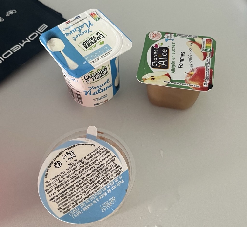 Un peu plus tard, l’infirmière me l’avait annoncé, je reçois un petit pot de glace vanille-chocolat et viennent juste après un yogourt nature et un petit pot de compote aux pommes, c’est royal.