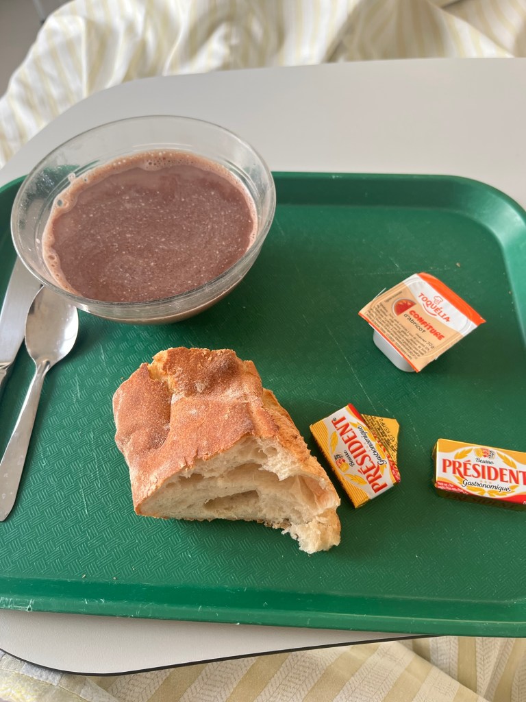 Ensuite ré antibiotique et toujours les contrôles pression etc. Le petit déjeuner arrive, j’ai choisi, oui on a le choix, chocolat au lait chaud, pain, confiture et beurre,ça m’a bien revigoré.