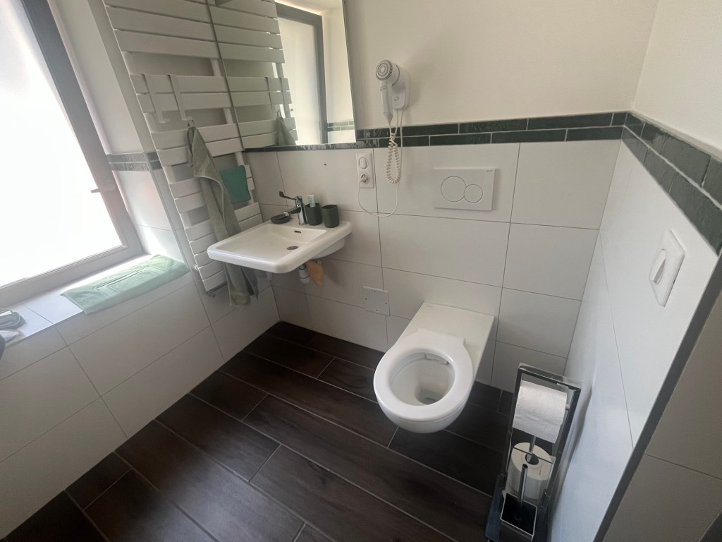 Elle me montre aussi la douche-wc-lavabo, très spacieuse et pratique.