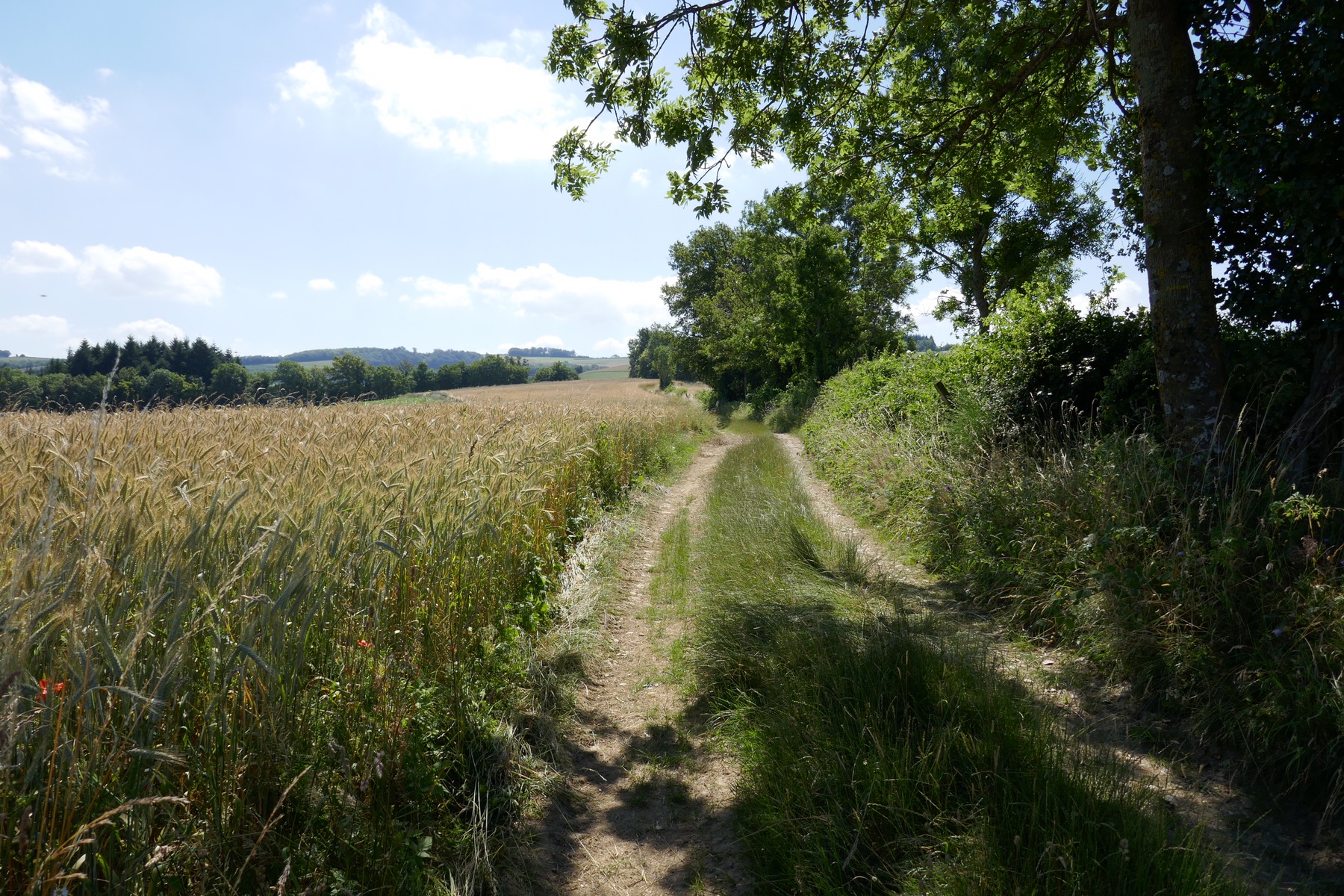 Suite à l’expérience de hier, j’ai pris la décision de passer par les monts (c’est pas assez haut pour les appeler montagnes), ça va probablement me prendre 2, 3 ou 4 jours de plus, mais au moins la promenade sera belle; c’est déjà le cas ce matin, nous rejoignons le GR et nous sommes en pleine campagne sur des vrais chemins pour marcheurs.