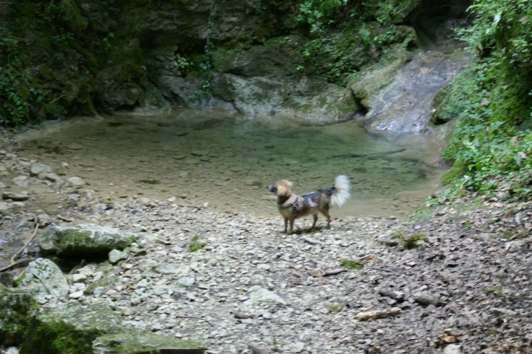 Nous arrivons à 12:30 à Pont-en-Royans, et une terrasse de restaurant apparaît devant-nous, miam! Je commande le menu du jour sans savoir ce qu’il y a. C’était délicieux : une immense salade avec oeufs, mesclun, tomates et même des lentilles, ensuite filet de truite saumonée avec haricots verts et comme dessert une faisselle de fromage blanc avec de la crème, j’adore. Héra avait spontanément reçu un grand bol d’eau et ensuite elle c’est installée sous la table pour dormir.