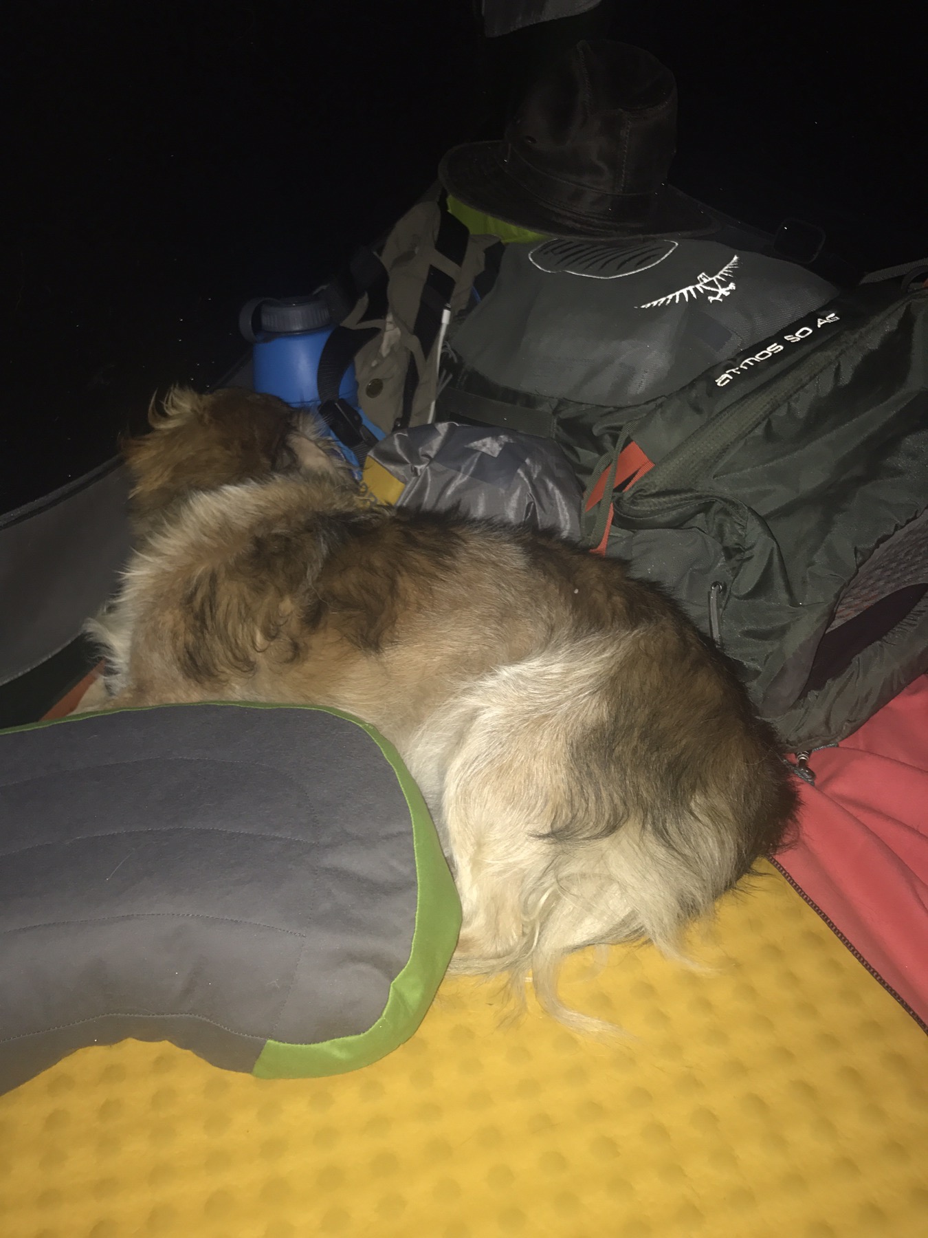 Vers le matin, Héra a grimpé sur les affaires qui sont vers ma tête et est venue s’installer contre ma tête, elle a dû avoir un peu froid, on s’est réveillé le matin dans cette même position.