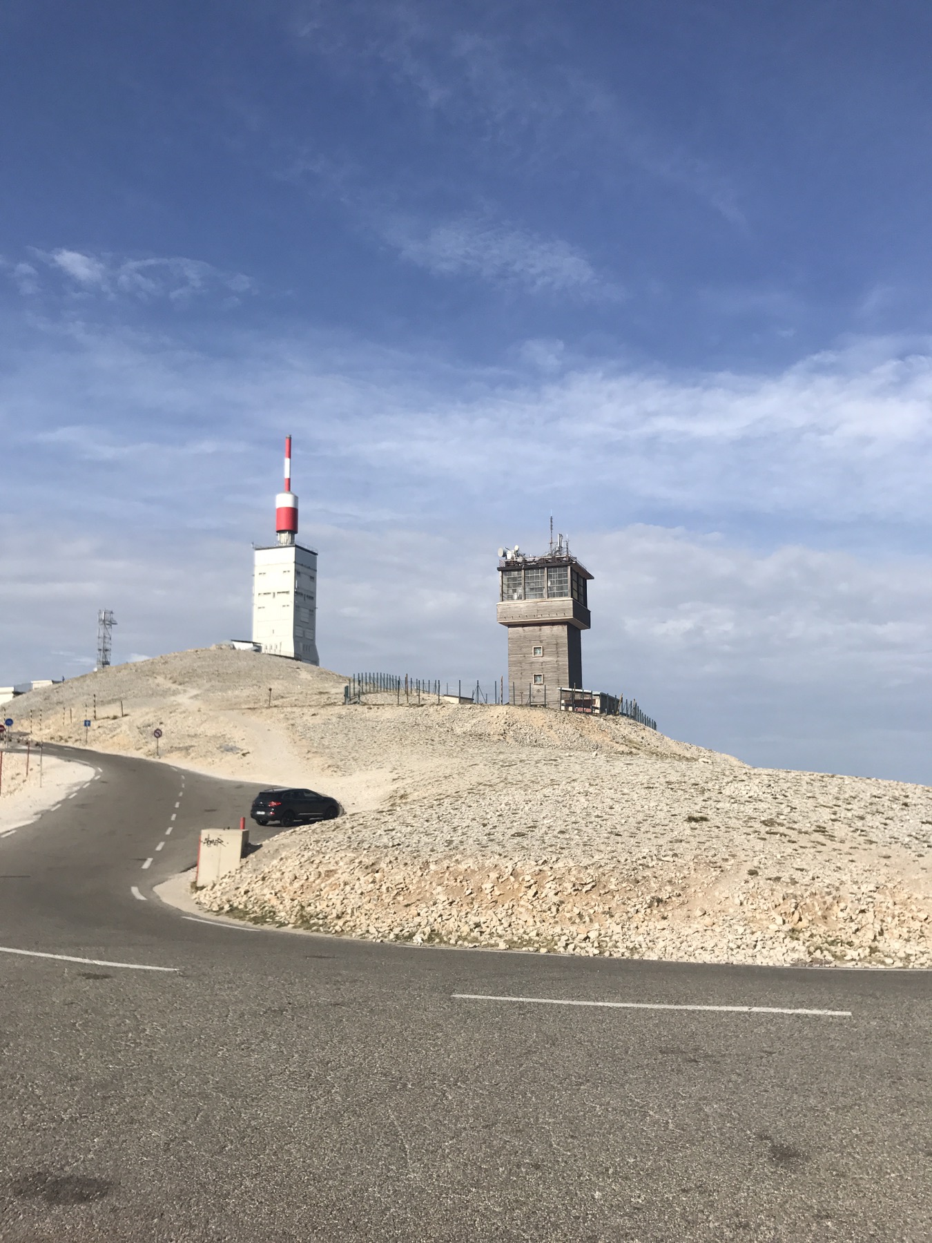 En haut du Ventoux et une partie de la descente, j’ai testé une nouvelle pièce vestimentaire, j’ai mis mon « Buff » autour du cou comme un col roulé amovible. Un « Buff » est une sorte de cylindre de tissus, le mien c’est du tissus très fin, mais chaud car il est en laine de mérinos. Je l’ai adopté et j’en suis totalement satisfait.