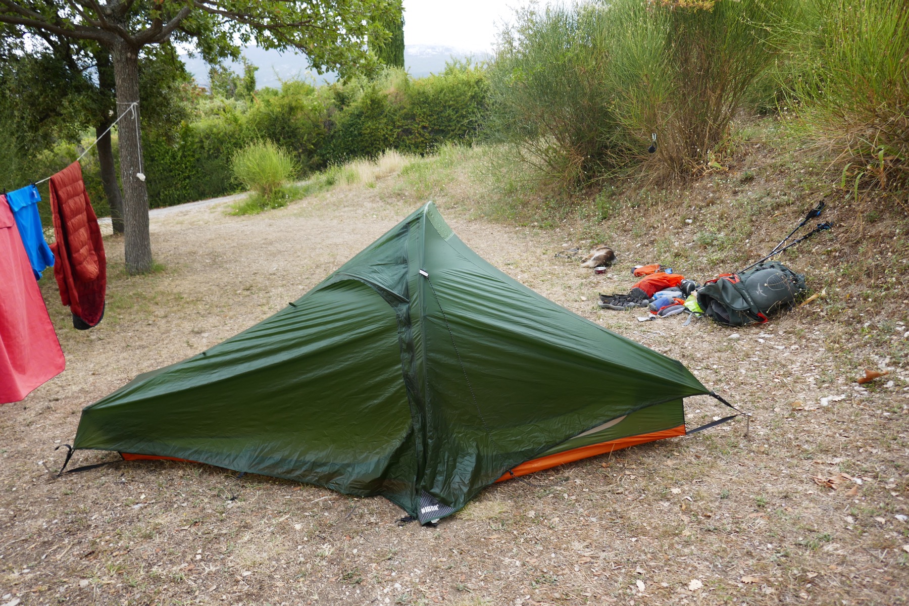 On arrive à Flassan, très charmant tout petit village, il y a un petit camping municipal, qui d’ailleurs ferme demain, donc même s’il pleut, je dois plier le camp et partir, le camping est vieux, mais tout fonctionne, lessive, douche , youpiiiii ce sont des anciennes douches avec deux robinets, alors j’ai pu finir avec une douche froide.