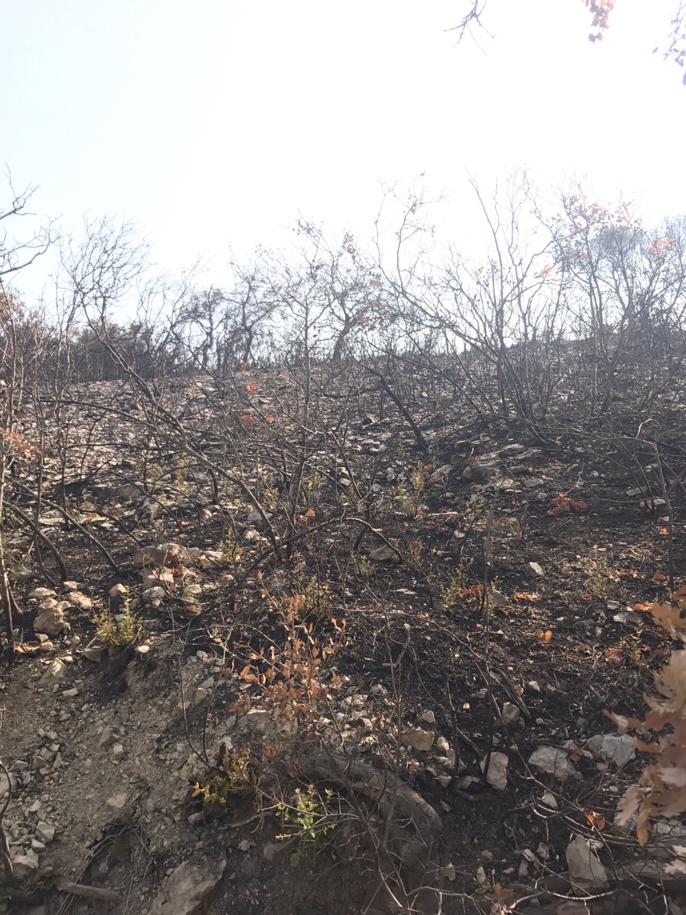 En route pour Éguilles, je profite de traverser un bout de massif forestier (zone orange, je peux jusqu’à 12:00), ors, il se trouve que ce massif à brûlé le 16 juillet, 800 hectares ont été détruis par l’incendie.