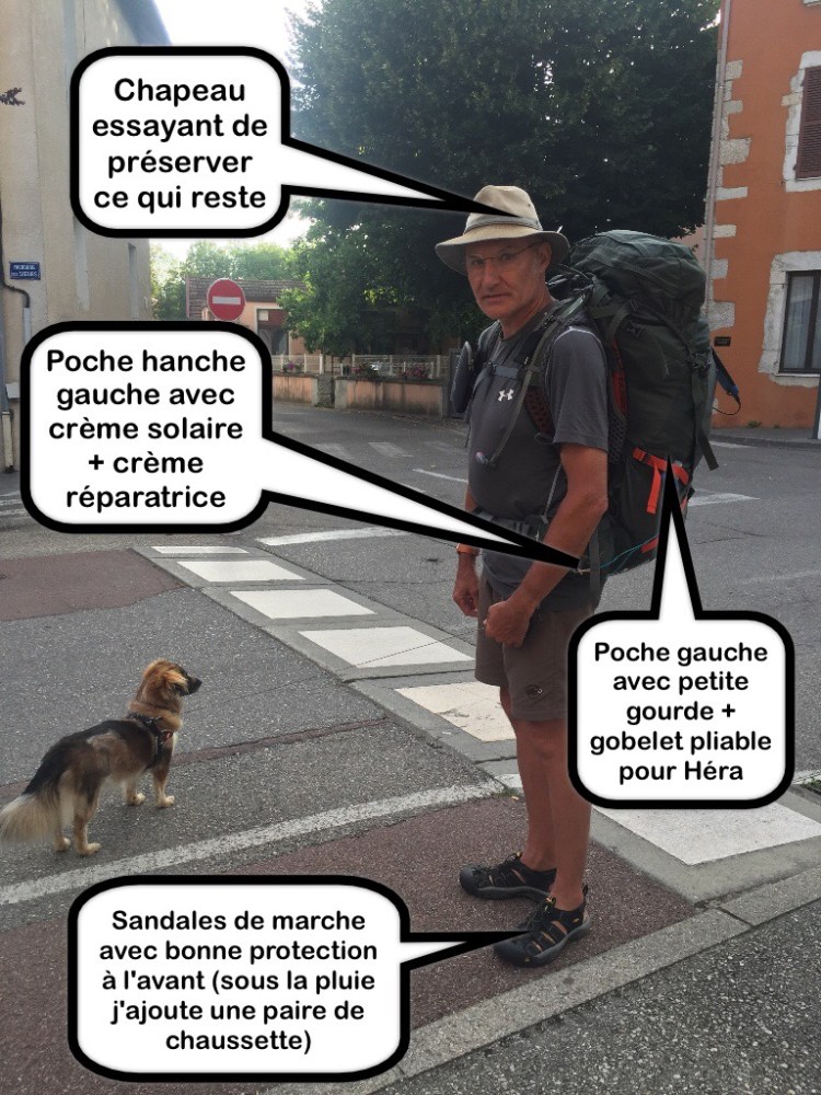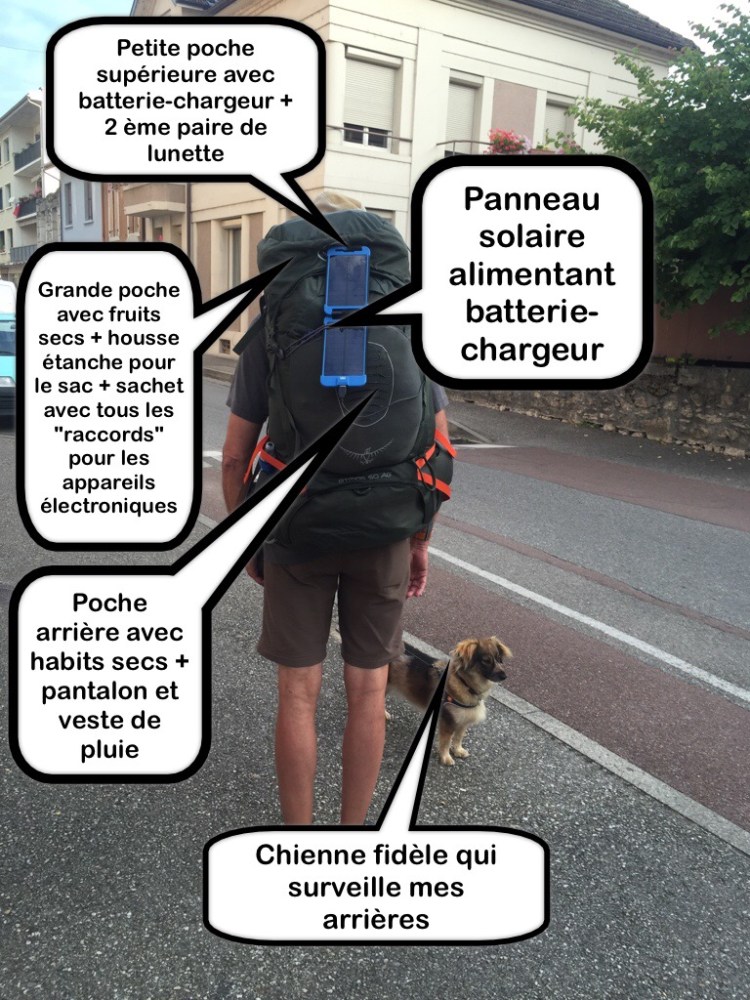 Un sac à dos, bien rempli, mais avec le strict minimum comme habits et comme nécessaire de toilette, une mini tente avec sac de couchage et mini-matelas, sur moi une paire de soulier et une paire de bonnes sandales pour les jours chauds; mais ce qui pèse un peu, c’est ce qui me permet de « garnir » ce blog : un iPhone, un miniIpad, un petit appareil de photo, et tout ce qu’il faut pour charger les batteries.